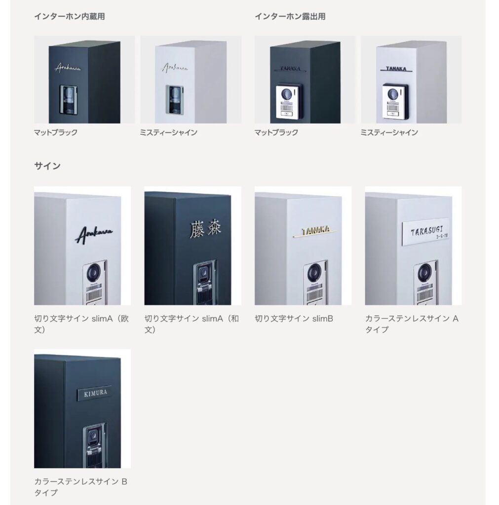 インターホンを内蔵、露出、表札も種類があるので自分好みの門柱に。