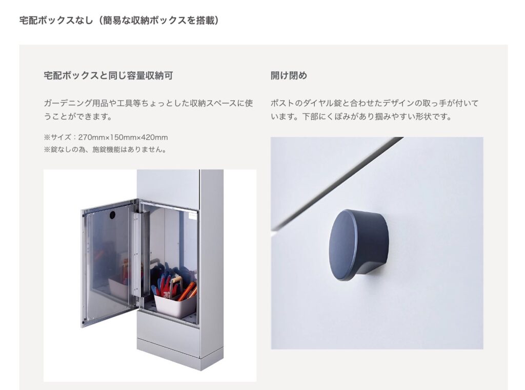 宅配ボックス不要な場合でも収納ボックスが搭載されているので便利です。
