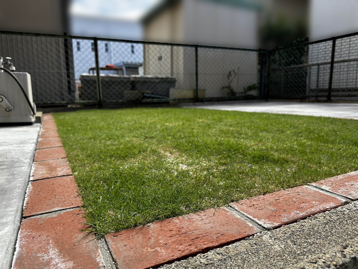 既設のカーポート、物置、ブロックを解体し、ブロックとカーポートを新設しました。天然芝の周りはレンガのミルドブリックで見切りました。