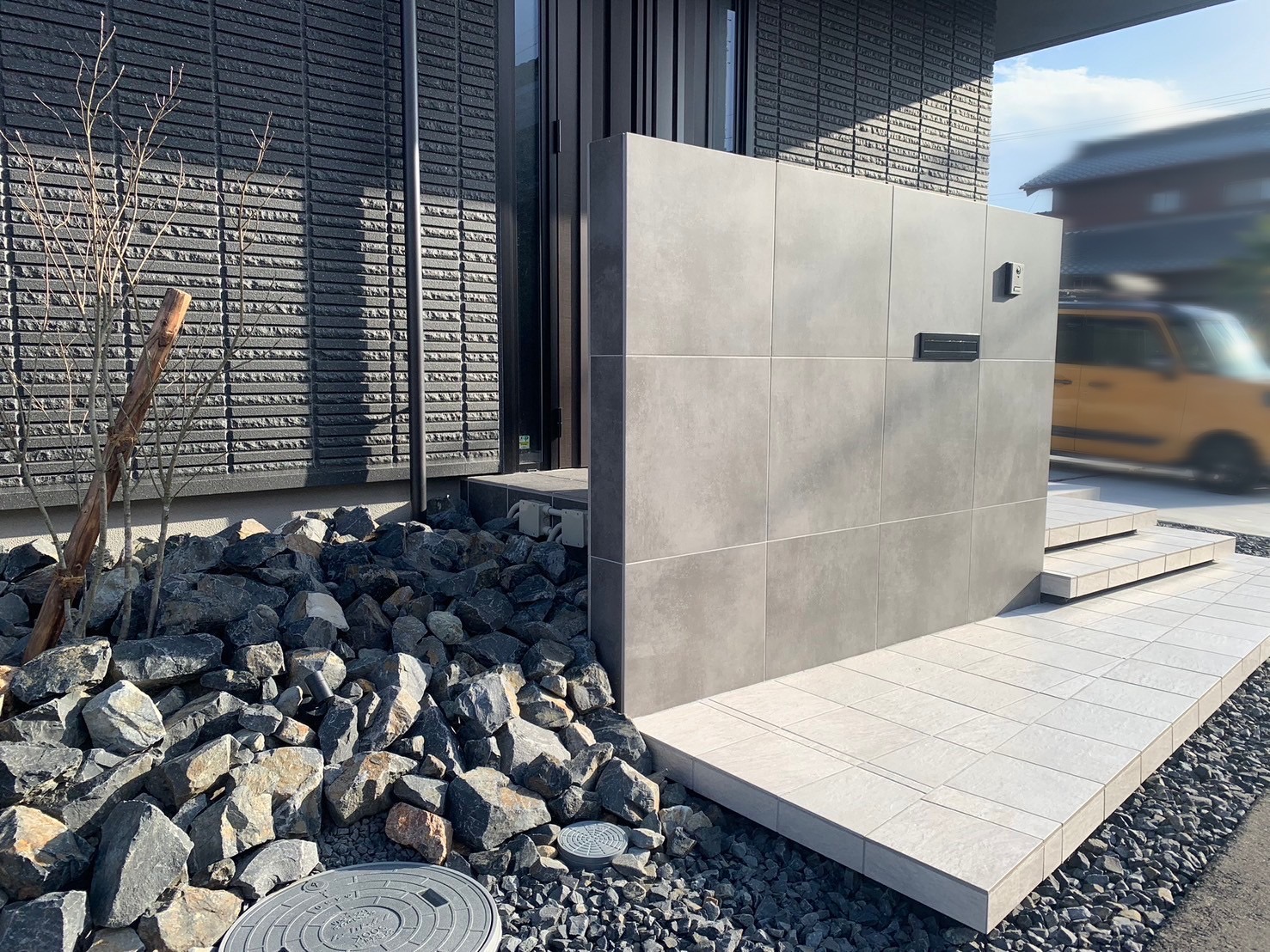 門柱横には植栽と栗石を配置し、ライトアップにより昼夜で異なる表情を楽しめる外構となりました。
