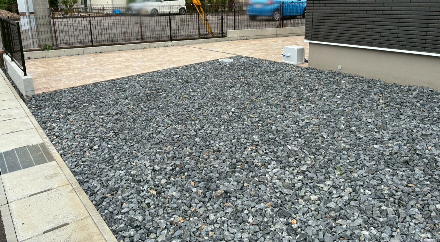 - カーポート/土間コンクリート/タイルテラス/機能門柱/フェンス/排水パン/外周防草シート+砂利