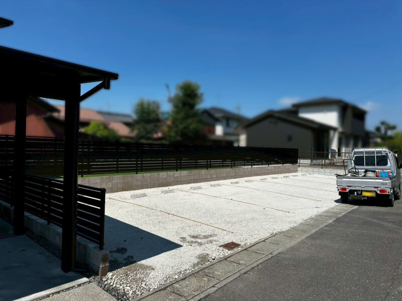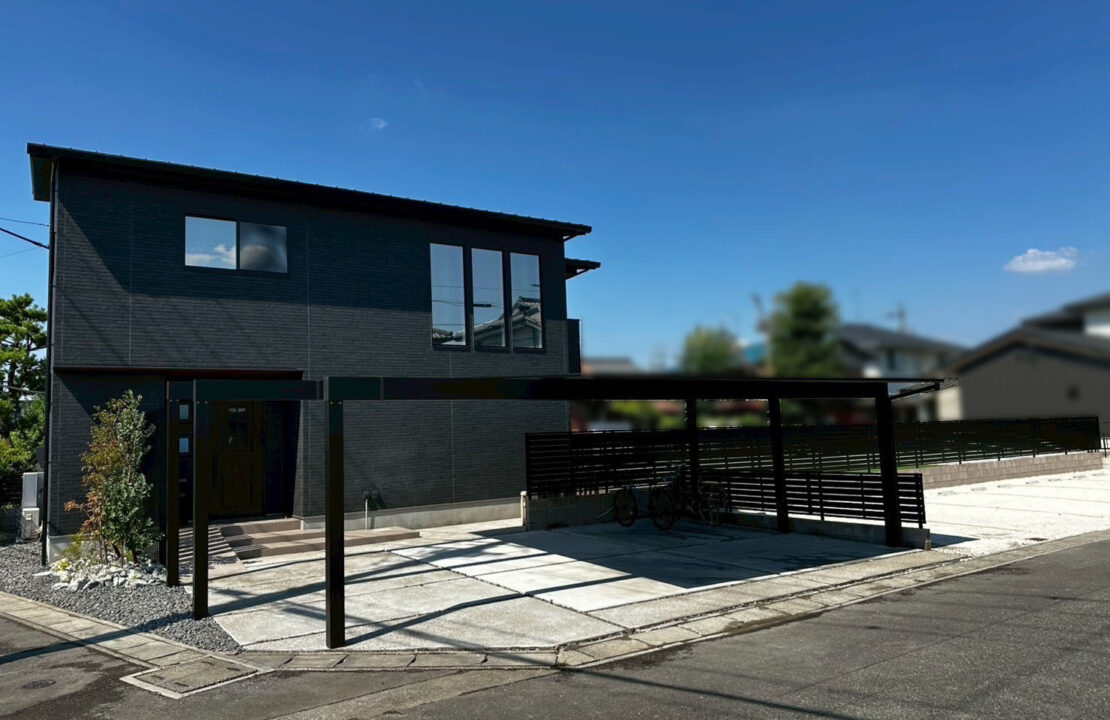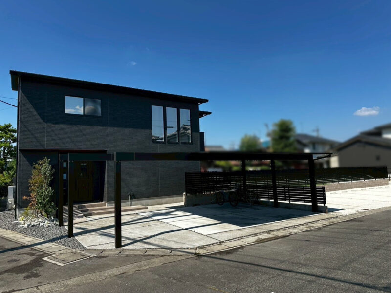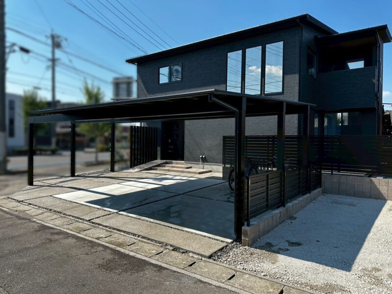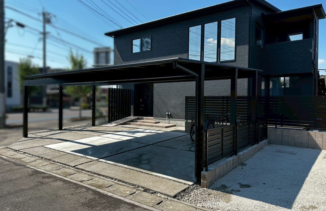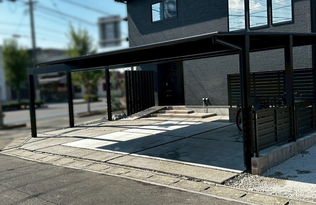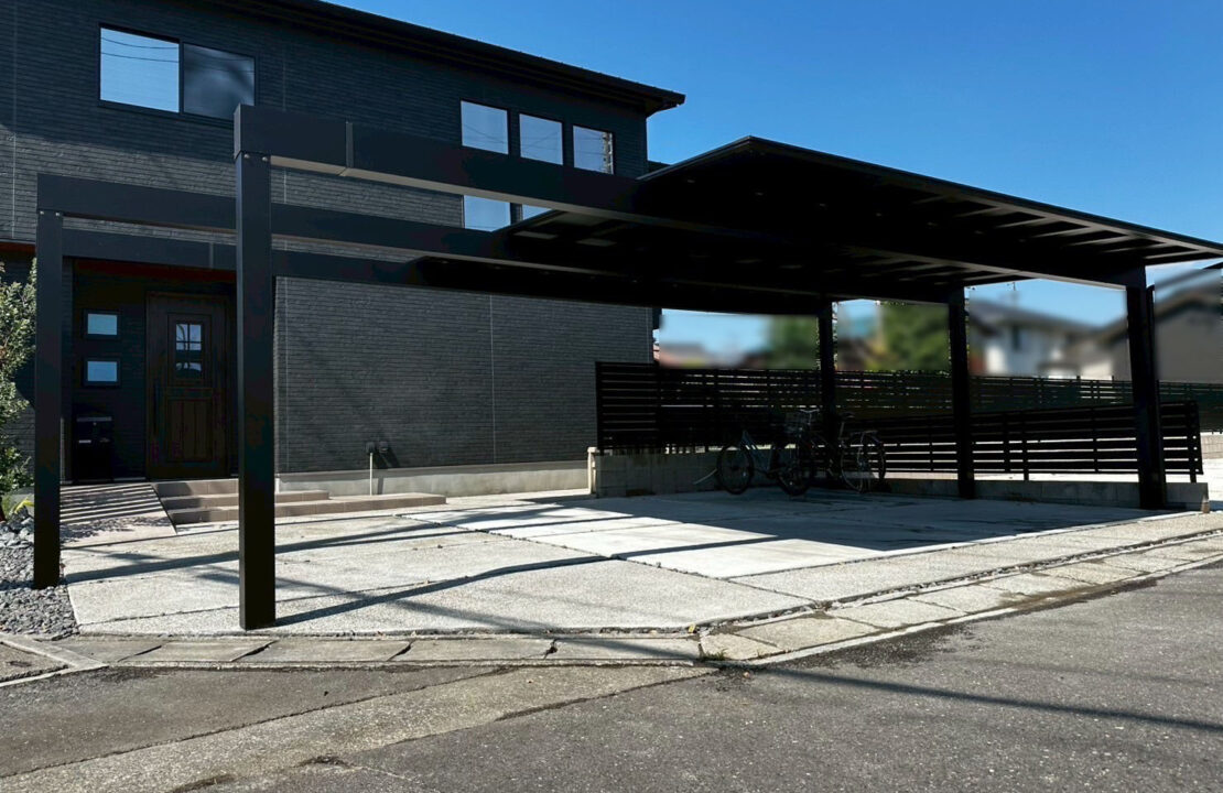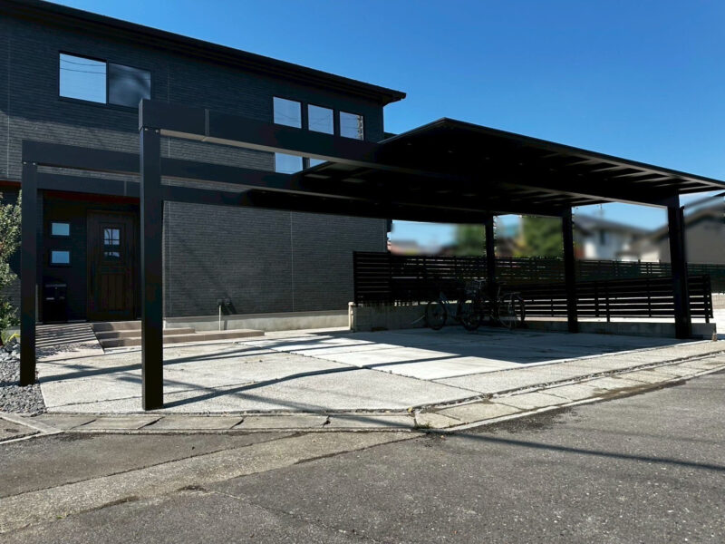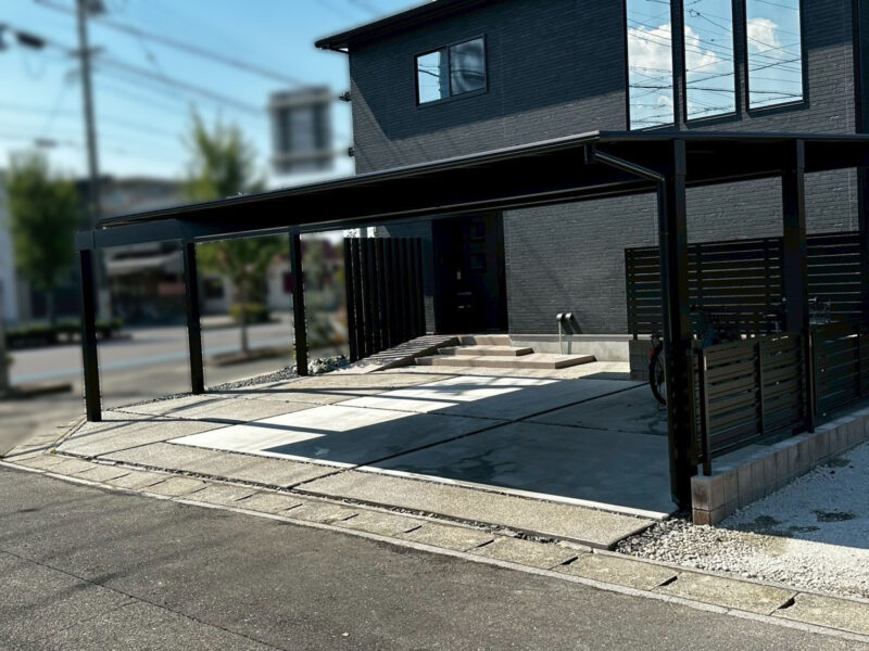 YKKapのエフルージュFIRST6002台用カーポートの梁延長タイプで設置し、広々とした駐車場に。駐車場の土間コンクリートも駐車部分は金鏝仕上げ、玄関に続くアプローチ部分は洗い出し仕上げと、仕上がりを変えています。