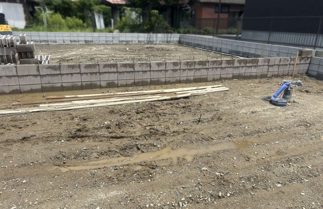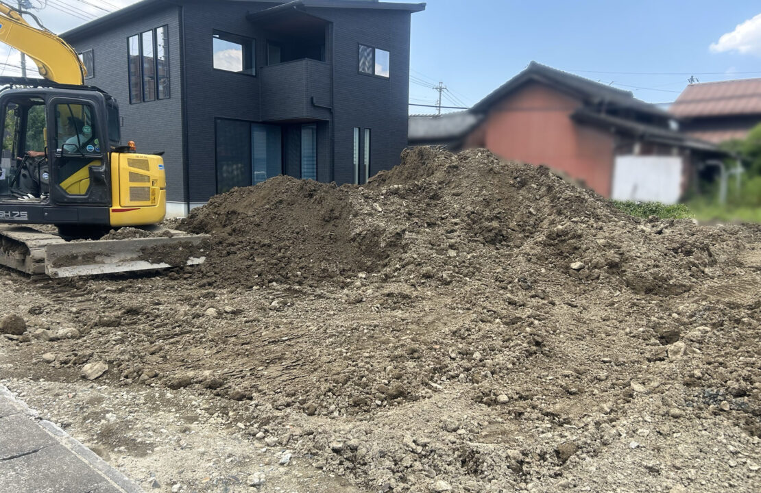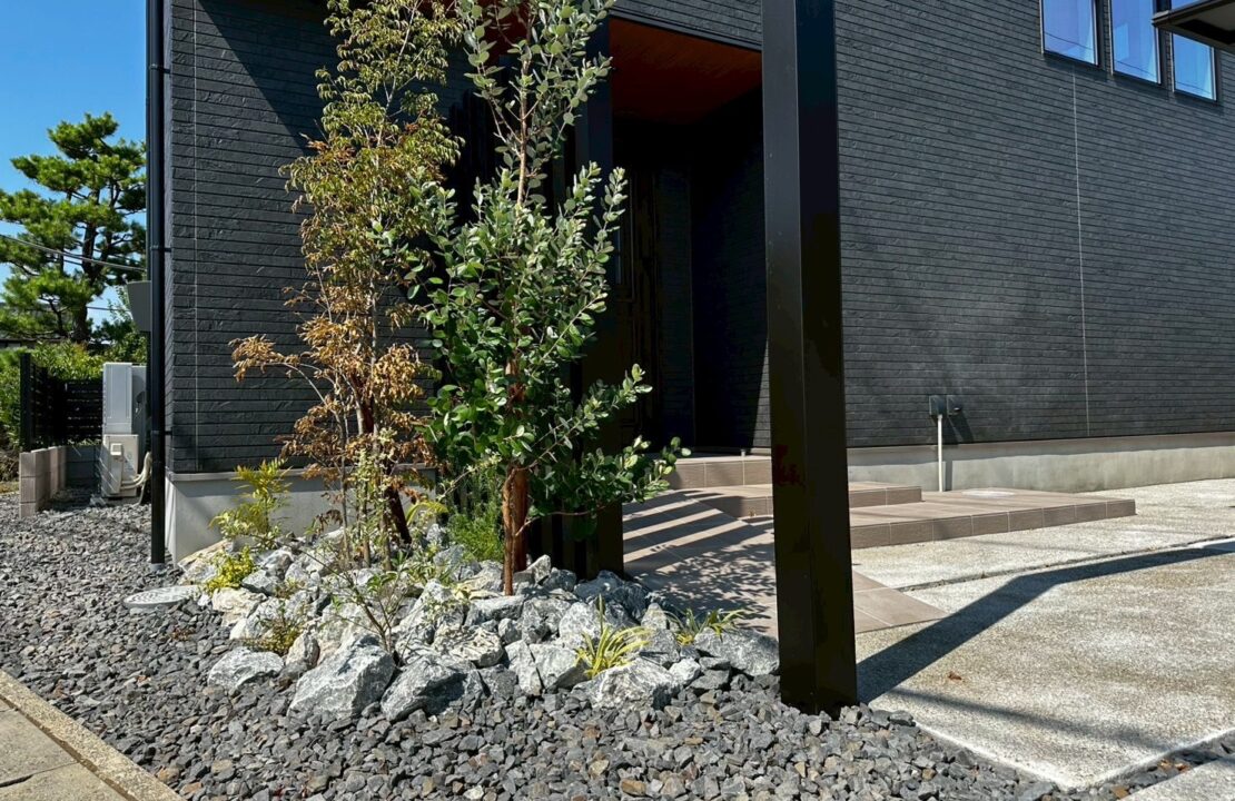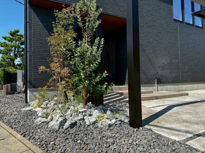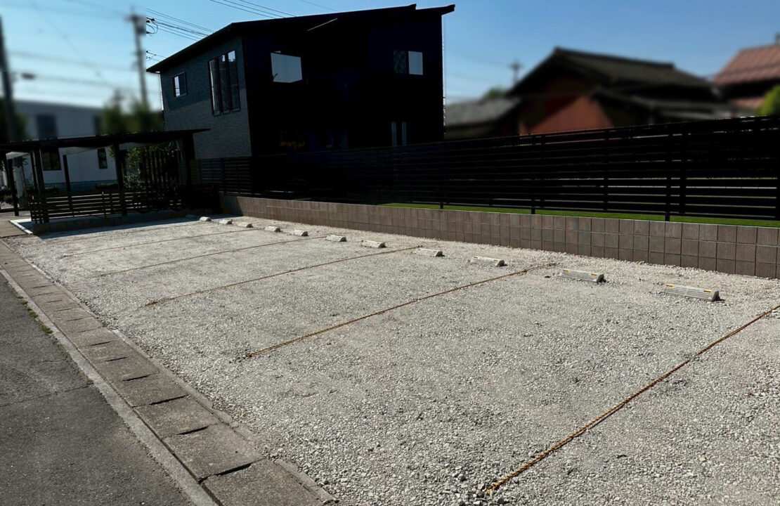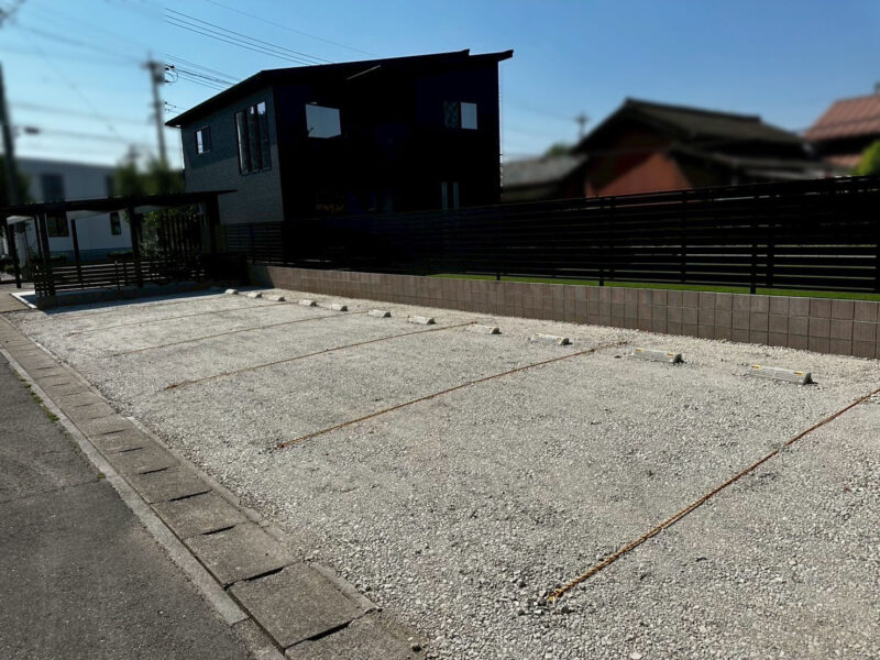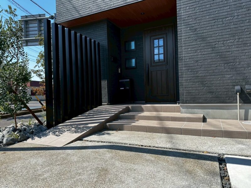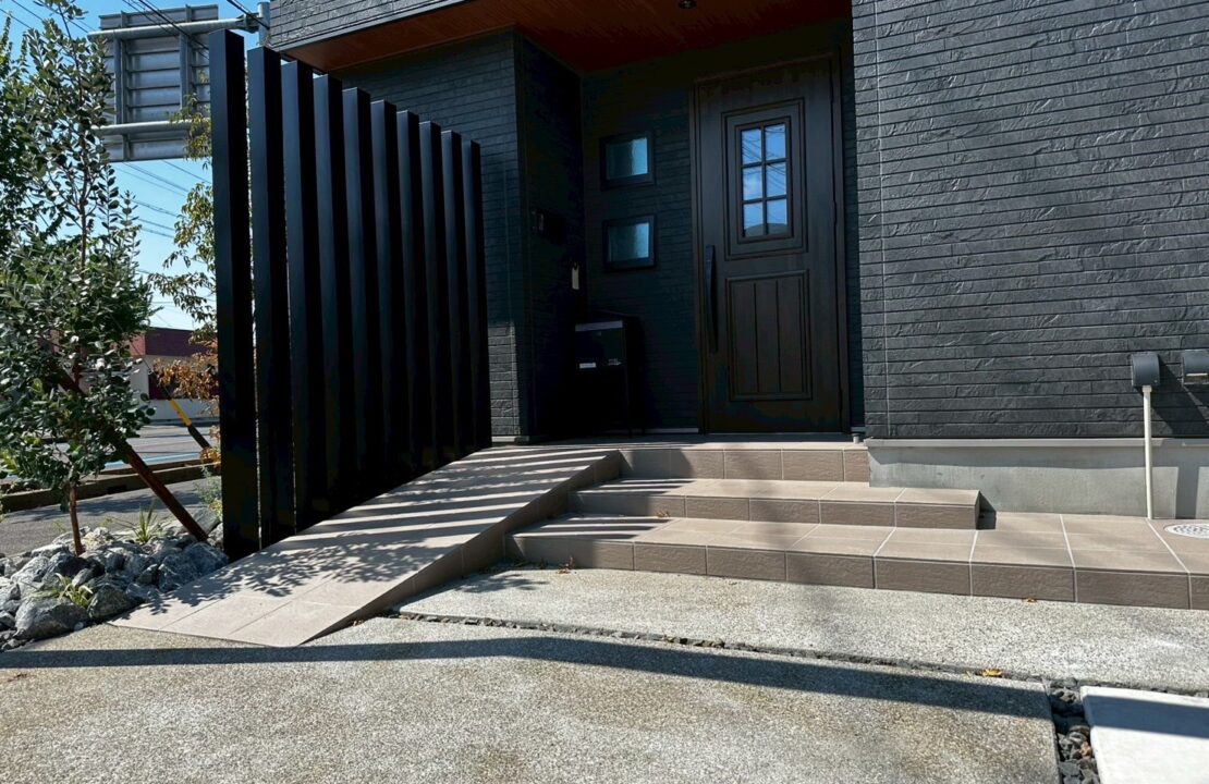 YKKapのエフルージュFIRST6002台用カーポートの梁延長タイプで設置し、広々とした駐車場に。駐車場の土間コンクリートも駐車部分は金鏝仕上げ、玄関に続くアプローチ部分は洗い出し仕上げと、仕上がりを変えています。