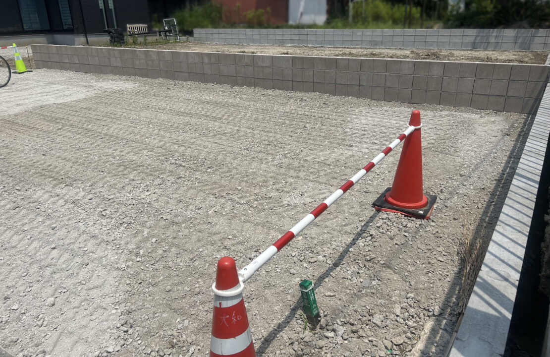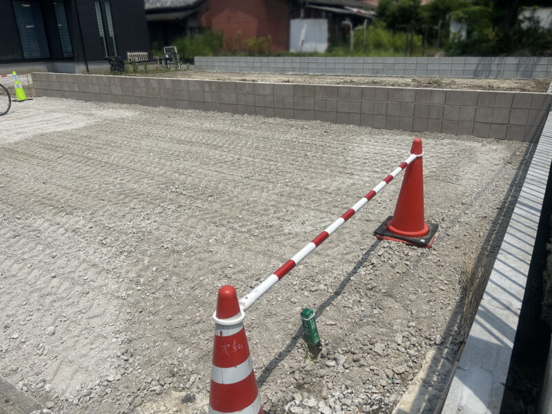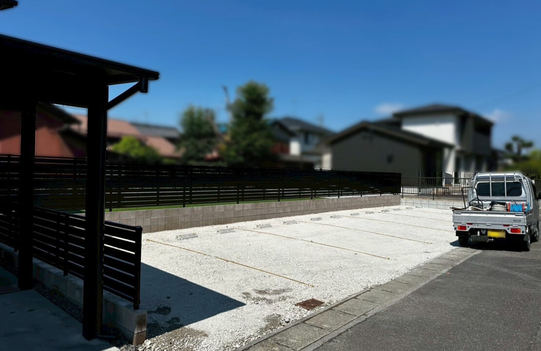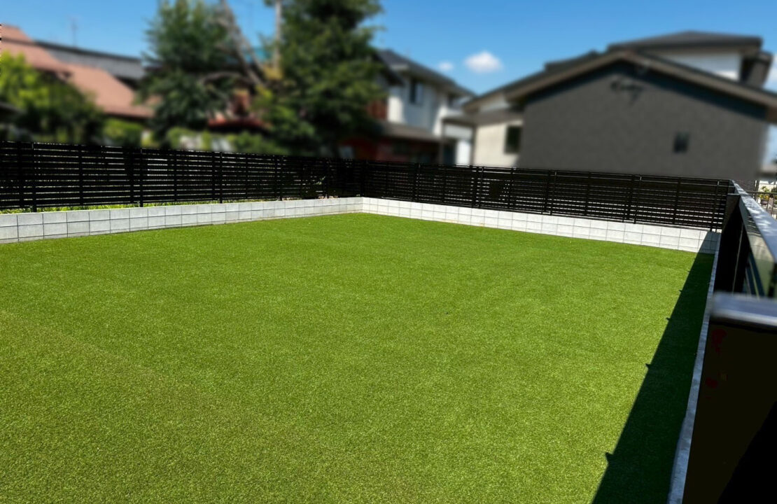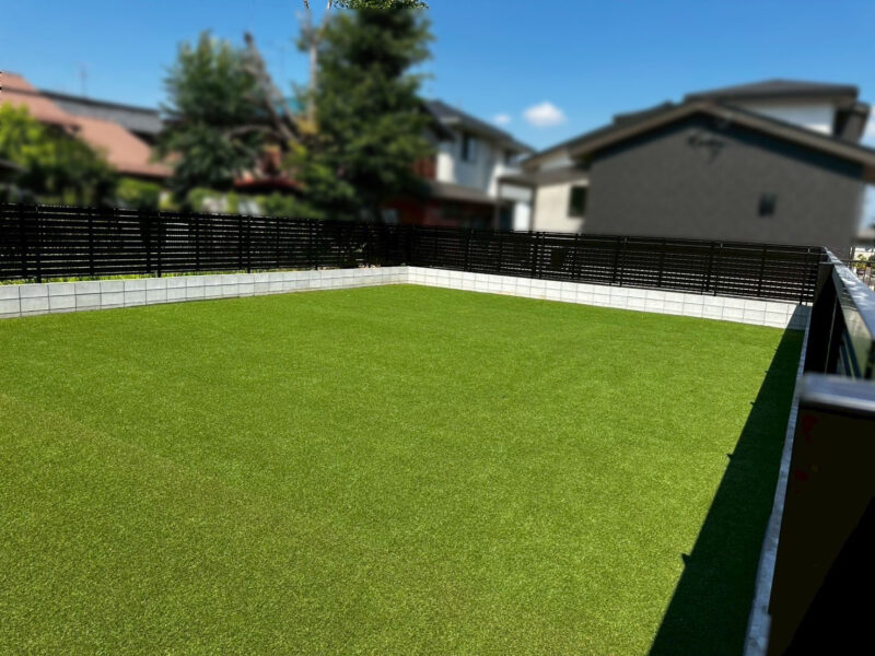 - 梁延長カーポート/人工芝/ウッドデッキ/目隠しフェンス/土間コン駐車場/砂利駐車場/植栽/
