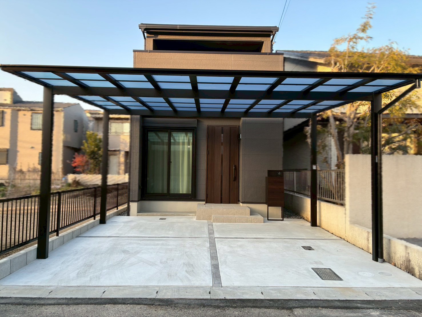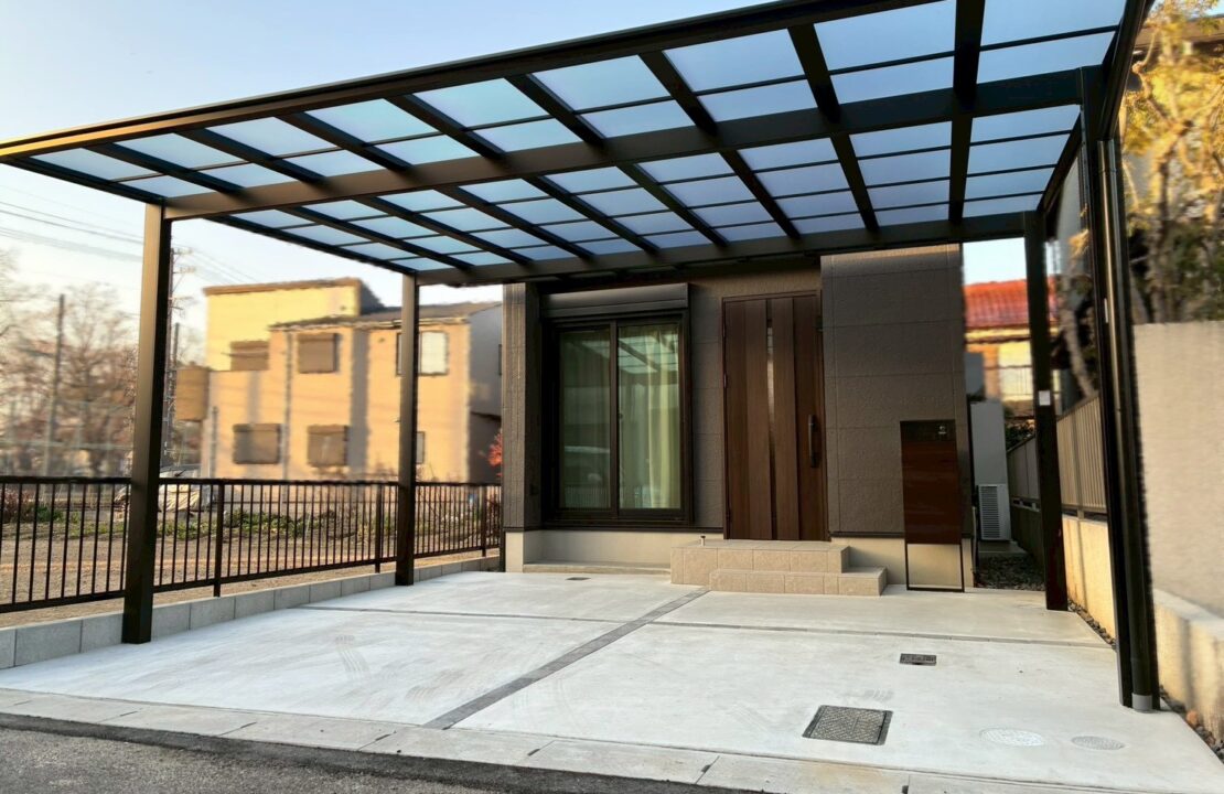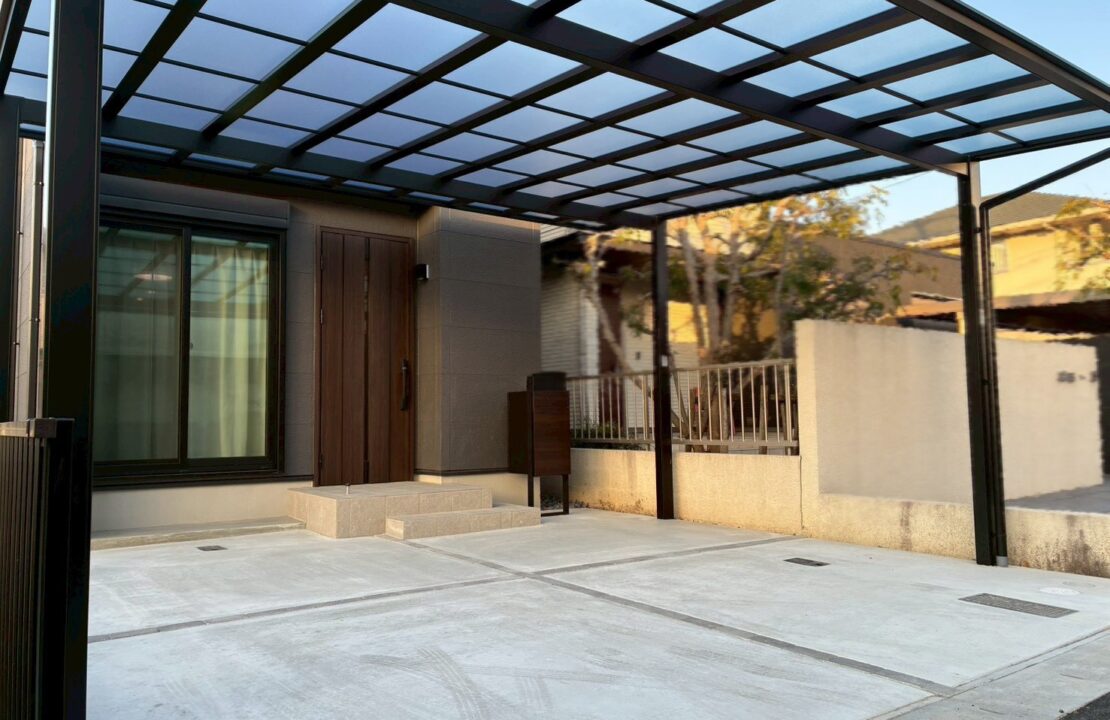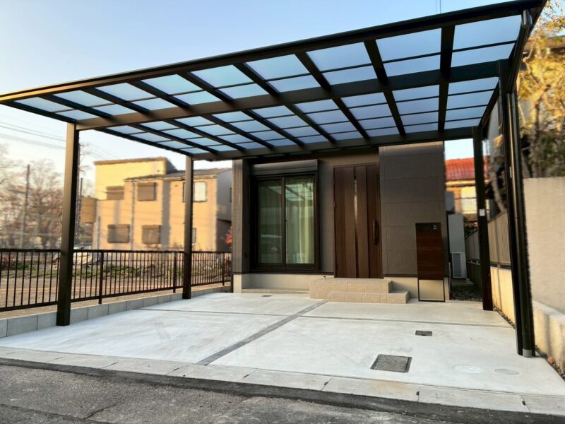 機能門柱、カーポートフレームを落ち着いたトーンでまとめ、新築住宅にふさわしい上質な外構デザインに仕上がりました。