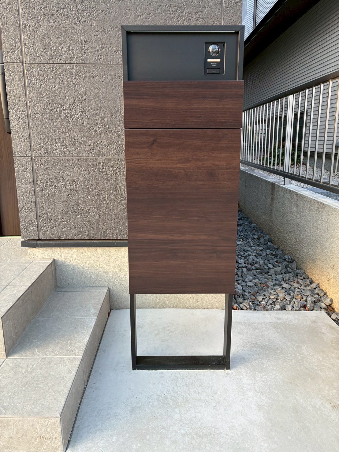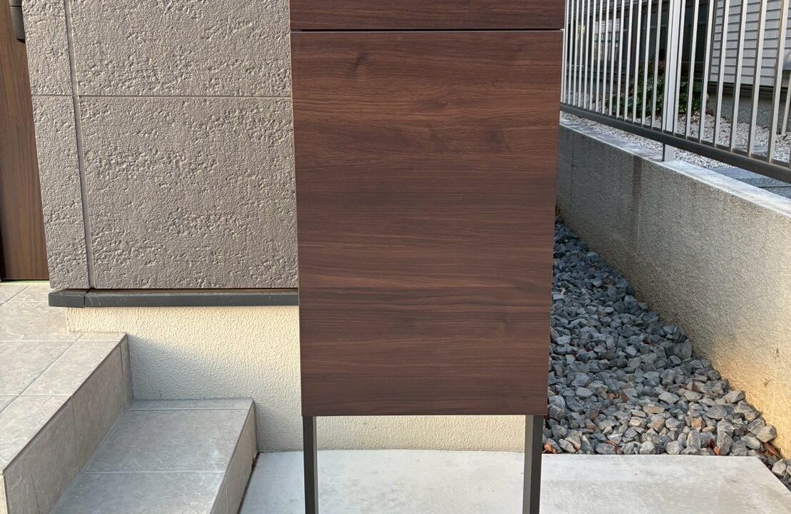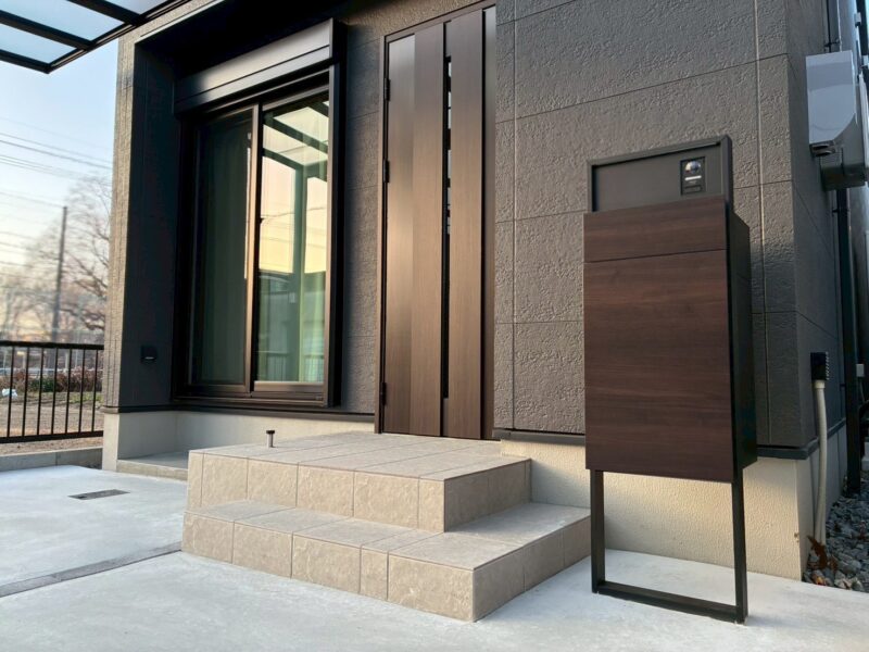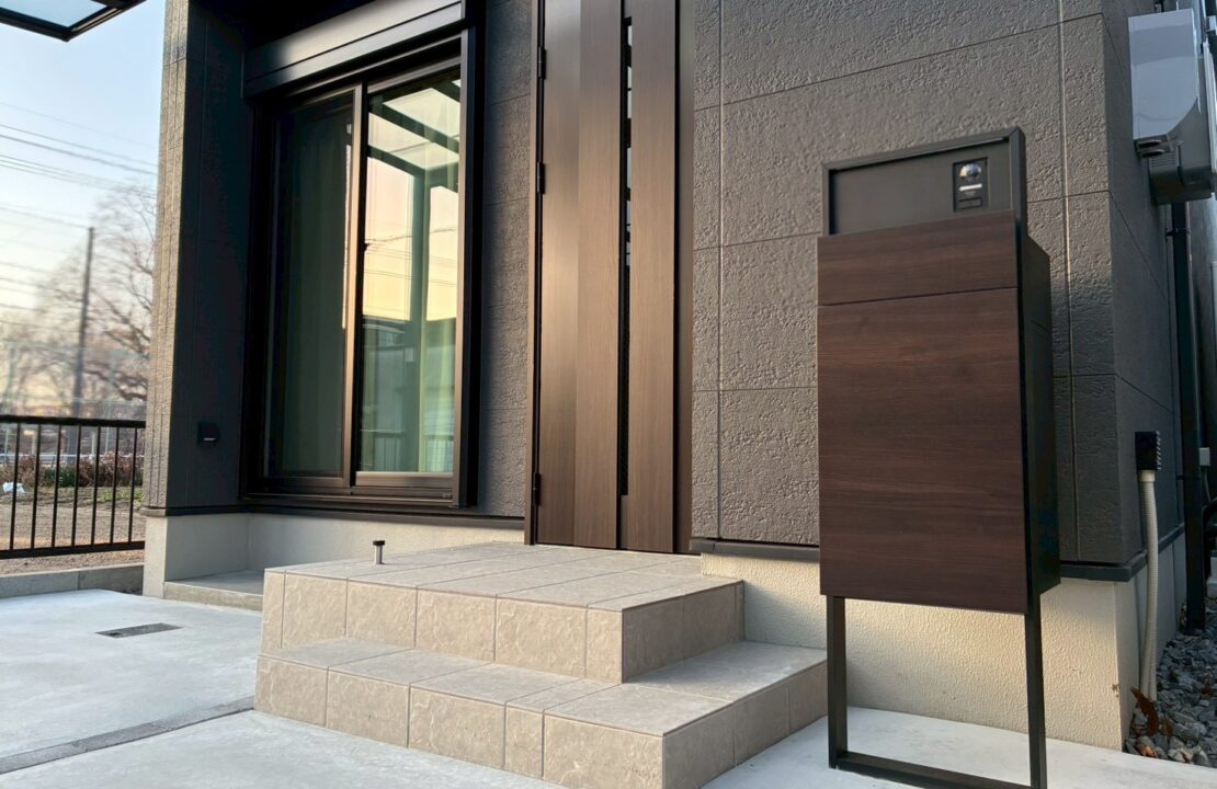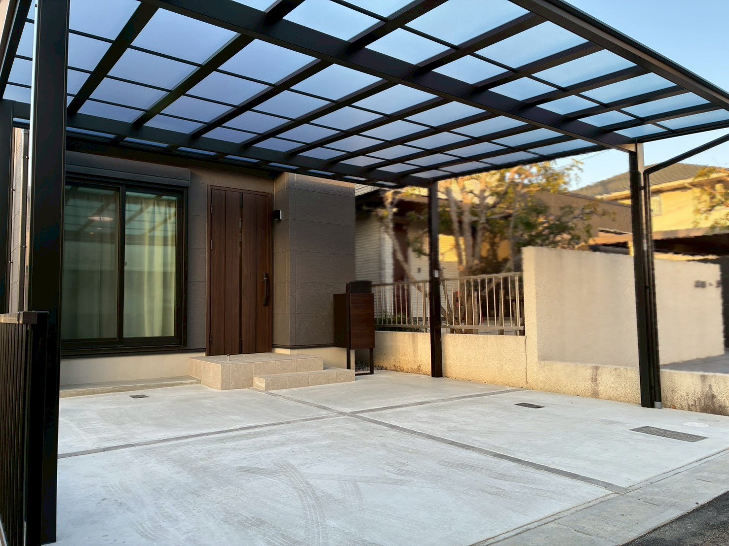 機能門柱、カーポートフレームを落ち着いたトーンでまとめ、新築住宅にふさわしい上質な外構デザインに仕上がりました。